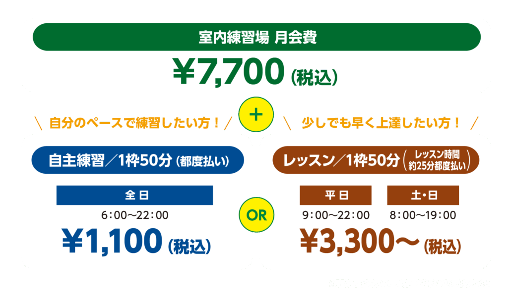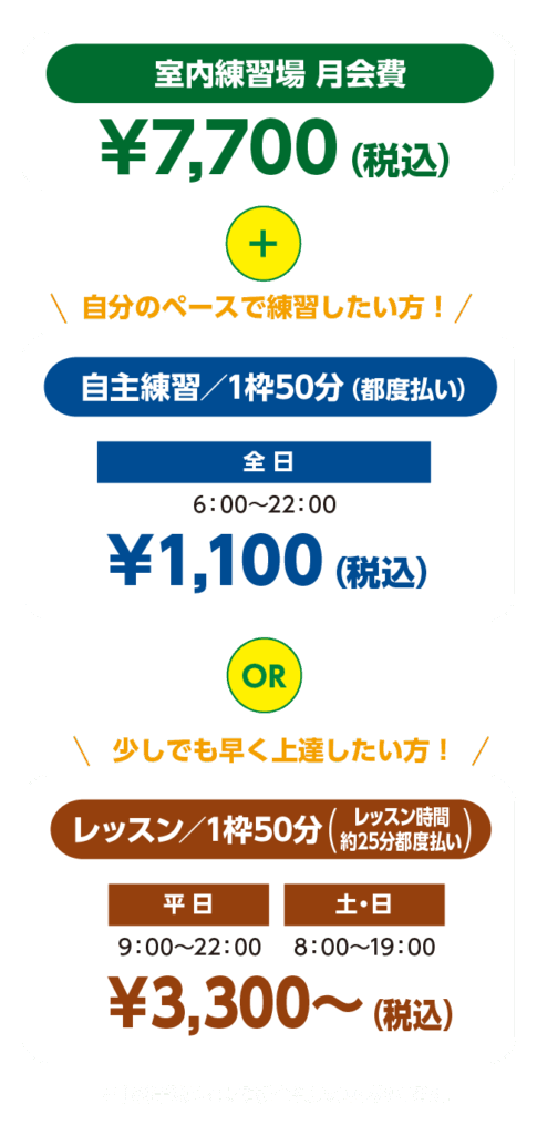 月会費+自主練orレッスンのどちらかを選べますので自分に合ったプランがで 1コマ50分間ご利用いただけます。 利用可能な曜日、時間帯などによって料金が異なります。